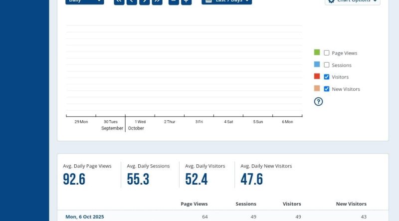During the observation period from September 29 to October 6, 2025, an inconsistency was found in the Summary Stats section on Statcounter, particularly in the chart and daily statistics summary. Several journal administrators reported that the chart on the Statcounter page did not display any data (blank), even though the table below still showed significant visitor numbers.